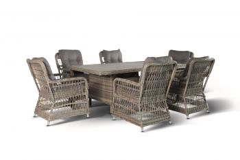 Садовая обеденная группа на 6 персон «Цесена» из ротанга. В комплекте: большой прямоугольный обеденный стол (2000×1000×720 мм) и 6 кресел (780×630×920 мм).