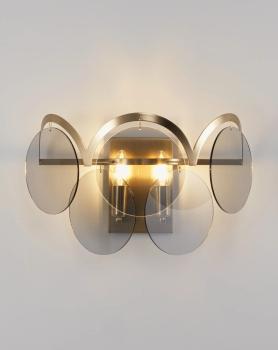 Изящный настенный светильник в стиле модерн. Металлический каркас из плавных линий гармонично сочетается с круглыми вставками из дымчатого стекла. В качестве источника света подойдут лампы с цоколем Е14. Бра прекрасно сочетается с люстрой и настенным светильником из одноименной коллекции. С помощью серии светильников Komo можно дополнить интерьер единой стильной композицией и качественным освещением.