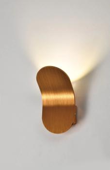 Минималистичный бра с современном стиле. Каркас из алюминия золотого цвета изогнутой формы крепится к стене с помощью планки. Мягкий свет рассеивается по поверхности для создания приглушенного освещения. В качестве источника света используются LED лампы с мощностью 5 Вт. Простой дизайн и компактность настенного светильника поможет украсить любой интерьер спальни, коридора или прихожей, идеально смотрится в комплекте из нескольких бра.