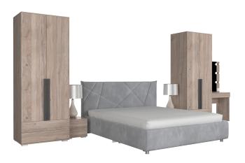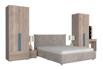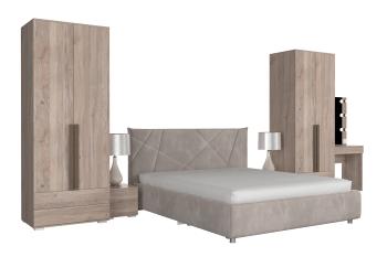 - Особенности: включает зеркало, тумбы, туалетный столик, кровать и шкафы