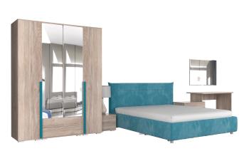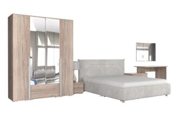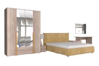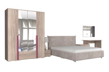 - Особенности: включает зеркало, тумбы, стол, кровать и шкафы