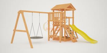 Независимо от выбранной роли, ребенок с удовольствием будет качаться на популярных сейчас качелях «Гнездо», взбираться по альпинистской стенке, карабкаться по сетке-лазалке, а потом резво спускаться вниз с горки. Для более спокойных игр комплекс оборудован лестницей с поручнями и балкончиком, а также песочницей и скамейкой.