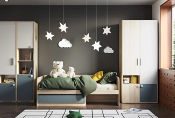 Детская Элиот комплектация 2. Состав комплектации: НМ 041.70 Шкаф для одежды с распашными дверцами, Размеры: Ш 934 x Г 586 x В 2202 + НМ 041.71 Шкаф-пенал с распашными дверцами, Размеры: Ш 484 x Г 400 x В 2202 + НМ 041.72 Шкаф-пенал с распашными дверцами, Размеры: Ш 484 x Г 400 x В 2202 + НМ 041.66 Кровать с выдвижным ящиком, Размеры: Ш 2042 x Г 946 x В 704. (Матрас к кровати приобретается отдельно размер: 900 х 2000мм). Направляющие ящиков: Шариковые, полного выдвижения.