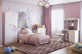 Модульная система позволяет легко расширять комплектацию – вы можете добавить пуф, дополнительный шкаф или выбрать кровать из ЛДСП вместо мягкого варианта. Все элементы гарнитура выполнены в едином стиле, создавая гармоничное пространство для ребенка.