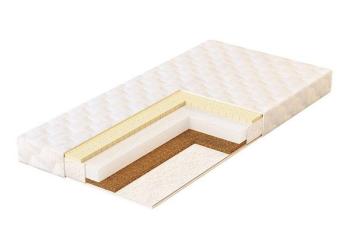 Беспружинный ортопедический двусторонний матрас средней степени жесткости. Сторона А — жесткая за счет плиты из многослойной кокосовой койры (1 см), сторона В — эластичная и упругая, благодаря латексной плите (1 см). Основа матраса — «Hollcon» высокой плотности (6 см). Съемный стеганый чехол на молнии выполнен из тика (100 % хлопок).