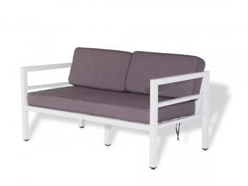 Трехместный диван «Эстелья». Каркас из алюминия, окрашенный в белый цвет, мягкие подушки на сидениях и спинках со съемными чехлами цвета «мокрый асфальт».