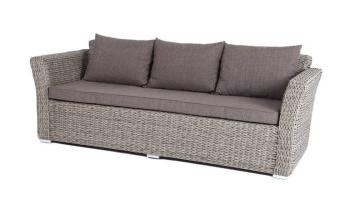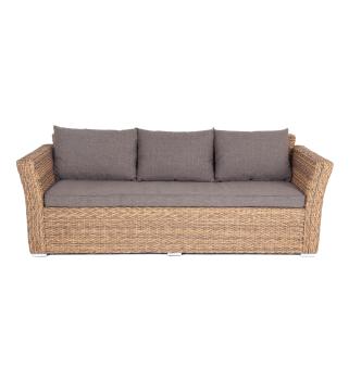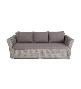 Трехместный диван укомплектован мягкими подушками, которые защищены съемными чехлами в серо-коричневом оттенке. При их пошиве используется износостойкий полиэстер, плотность которого достигает 230гр/м2. Предусмотрена влагоотталкивающая пропитка.