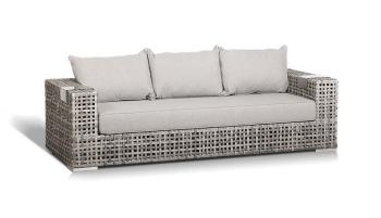 Размер модели – 2280×920×610 мм. Каркас оплетен вручную с помощью плоского искусственного ротанга – 18×3,5 мм. Мебель выполнена в сером оттенке.