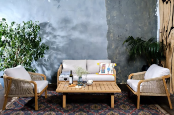 RIMINI – современная коллекция садовой мебели из акации, выполненная в комбинации натурального веревочного плетения rope, массива акации и бежевых подушек.