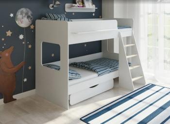 Под нижним ярусом размещен вместительный выдвижной ящик, который подойдет для хранения постельного белья или игрушек.