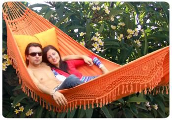 Стильный, большой комфортный гамак FORRO сделан из высококачественного хлопка, мягкое волокно которого прекрасно адаптируется к форме тела и дышит. Полотнище гамака отделано бахромой (hand made), которая сплетена из волокон настоящего бразильского ореха и сделана в цвет полотна гамака. Гамак такой формы это традиционная форма исконно южно американских гамаков, «правильно» и удобно лежать в таких гамаках по диагонали .