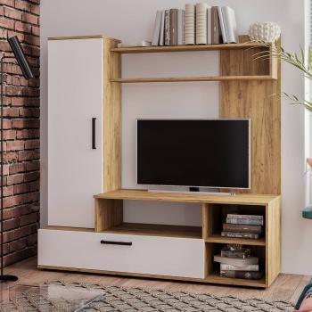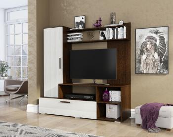 Изготовленная из ЛДСП, корпус выполнен в цвете дуб крафт, а фасады — в белом оттенке. Размеры ниши под телевизор составляют 110х42,4х90 см, что позволяет разместить технику с комфортом. Сборка данной модели не универсальная, что делает ее более специализированной для определенных интерьеров.