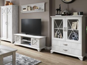 Каркас выполнен в стильном белом цвете, а фасады имеют отделку в дизайне “бетон пайн белый”. Этот классический стиль добавляет изысканности вашему пространству. Гостиная состоит из качественных материалов: каркас изготовлен из ЛДСП, а фасады из МДФ с красивыми накладками.
