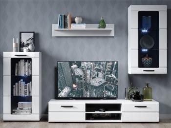 Стенка Рио выполнена в современном стиле. Белые глянцевые фасады из МДФ и витрины с прозрачным стеклом создают в помещении ощущение простора и легкости. Задняя стенка из ЛХДФ Кроношпан (Австрия) черного цвета красиво контрастирует с фасадами и корпусом белого цвета.