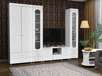 “Гостиная Афина-2 – яркий и современный комплект для гостиной. Отличительная особенность серии – это фасады из высококачественной МДФ с объемным узором.