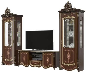 В комплектации № 6 гостиная Шейх состоит из двух шкафов-витрин 1-дверных левого и правого, и солидной тумбы TV. Роскошная стеночка для уголка отдыха восхищает изысканной красотой, богатством отделки и визуальной лёгкостью. Своей воздушной прелестью гостиная Шейх обязана изяществу форм, обилию стеклянных вставок, блеску декора.