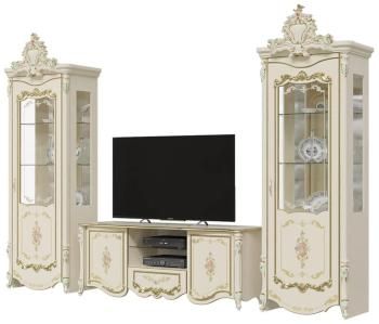 Вместительная тумба TV с аристократическим дизайном – частичка изысканного уюта гостиной в дворцовом стиле. Тумба оборудована по боками – двумя закрытыми отделениями, в центре – открытой нишей и выдвижным ящиком. Широкая столешница, за распашными дверьми – по одной полке, ниша со стеклополкой – всё красиво и удобно!