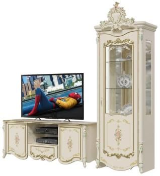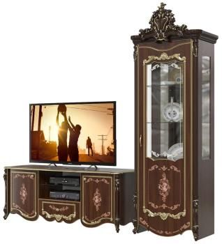 В комплектации № 7 гостиная Шейх состоит из изящного шкафа-витрины 1-дверного правого и солидной тумбы TV. Практичный гарнитур с аристократическим дизайном – частичка изысканного уюта Вашей гостиной в дворцовом стиле.