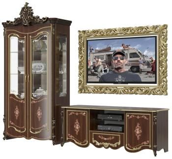 Вместительная тумба TV с аристократическим дизайном – частичка изысканного уюта гостиной в дворцовом стиле. Тумба оборудована по боками – двумя закрытыми отделениями, в центре – открытой нишей и выдвижным ящиком. Широкая столешница, за распашными дверьми – по одной полке, ниша со стеклополкой – всё красиво и удобно!