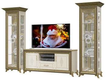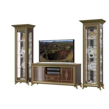 Гостиная Версаль – роскошный набор мебели, состоящий из двух шкафов-витрин и тумбы под телевизор, станет яркой жемчужиной интерьера Вашего дома. Мебель выполнена с поистине королевским размахом и выглядит, как произведение мебельного искусства. Мебель имеет выдающийся дизайн с витиеватым гравированным рисунком на стекле фасада, ручками “под старину”, богатой рамой, резными ножками и карнизами.
