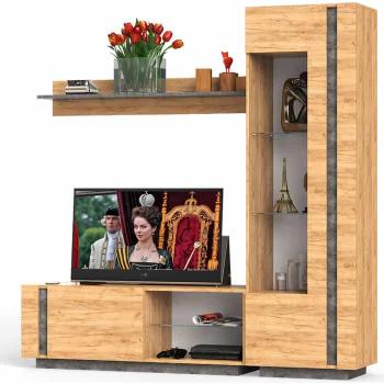 - Функциональность: включает полки для декора, закрытые дверцы для хранения и стол