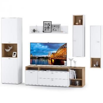 Модульная конструкция позволяет адаптировать мебель под ваши нужды. В комплекте идут вместительные шкафы с дверцами, удобная тумба с ящиками и открытая полка для декора. Ниша для телевизора оптимального размера (139 см) подойдёт для большинства современных моделей.