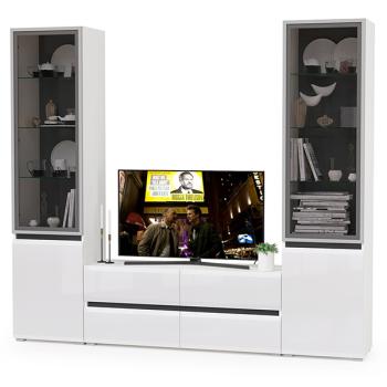 - Практичная комплектация: тумба под ТВ с 4 ящиками и две шкафа-витрины