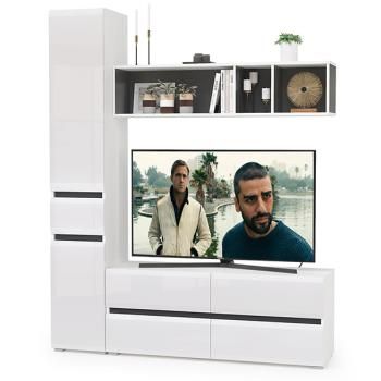 Современная гостиная Mobi Сидней комплектация № 14 – это идеальное сочетание элегантного дизайна и практичности. Модульная конструкция включает тумбу для ТВ, навесную полку и высокий шкаф с ящиком, что позволяет удобно организовать пространство и разместить все необходимые вещи.