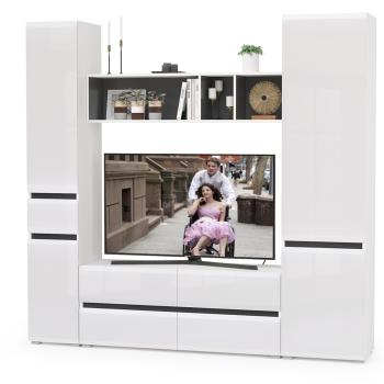 В набор входят:- Тумба для ТВ с четырьмя вместительными ящиками- Два высоких шкафа с полками и ящиками- Навесная полка с тремя асимметричными отделениями