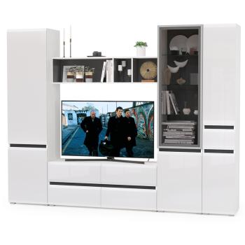 - Практичная комплектация включает тумбу для ТВ, навесную полку, шкаф-витрину и шкафы с различными типами фасадов