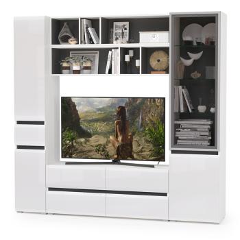 Модульная конструкция набора позволяет оптимально использовать пространство гостиной, создавая удобную систему хранения и эффектное оформление зоны отдыха. Глянцевые поверхности фасадов легко очищаются от пыли и следов пальцев, сохраняя безупречный внешний вид.