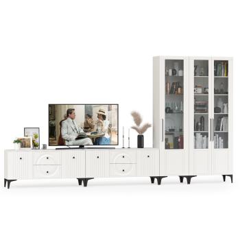 Комплект включает две тумбы под ТВ Валенсия 16.45 с удобными выдвижными ящиками и нишами за распашными дверками. Сервант и пенал объединены в стенку-библиотеку, что делает мебель не только красивой, но и практичной.