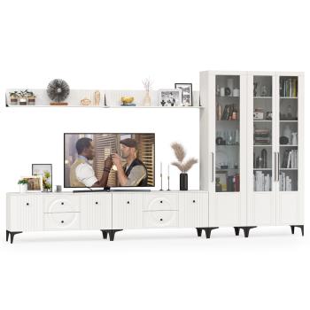 Эта модель сочетает в себе просторные системы хранения и современный дизайн. Две тумбы под телевизор с выдвижными ящиками и нишами за дверцами позволяют удобно организовать пространство. Над тумбами расположены полки для декора или книг, а сервант с шестью полками предоставляет дополнительное место для хранения.