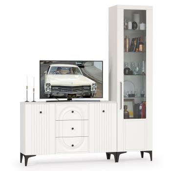 Гостиная Mobi Валенсия № 92 – это элегантное и практичное решение для современного интерьера. Комплект включает пенал со стеклянными полками и комод-ТВ-тумбу, выполненные в белом цвете с эффектной шагренью. Габариты (ШхГхВ): 188,2х38,4х225,2 см.