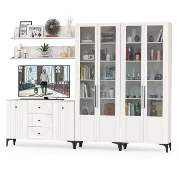 Центральным элементом комплекса является широкий комод с тремя удобными выдвижными ящиками и распашными дверцами по бокам. Над тумбой расположены две практичные полки для декора или полезных мелочей. Четыре стеклянные дверцы шкафа открывают доступ к шести внутренним полкам из ЛДСП, где можно разместить посуду, книги или коллекционные предметы.