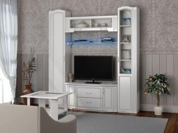 Модульная серия «Виктория» выполнена в стиле «Классика». Особенность серии – фасады МДФ сфрезеровкой, петли с доводчиком на всех фасадах, шариковые направляющие, ручки металлические с белой вставкой, покрытие золото. Стеклянную полку можно установить над и под телевизором, а также заказать на нее подсветку. Шкаф для одежды может быть укомплектован дополнительными полками для белья. Модульная серия Виктория выпускается такжев едином стиле в прихожей, молодежной испальне.НОВИНКАот фабрики Ижмебель – модульная гостиная Виктория, выпускается такжеспальняв едином стиле.