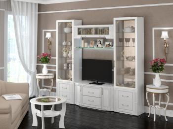 Модульная серия «Виктория» выполнена в стиле «Классика». Особенность серии – фасады МДФ сфрезеровкой, петли с доводчиком на всех фасадах, шариковые направляющие, ручки металлические с белой вставкой, покрытие золото. Стеклянную полку можно установить над и под телевизором, а также заказать на нее подсветку. Шкаф для одежды может быть укомплектован дополнительными полками для белья. Модульная серия Виктория выпускается такжев едином стиле в прихожей, молодежной испальне.НОВИНКАот фабрики Ижмебель – модульная гостиная Виктория, выпускается такжеспальняв едином стиле.