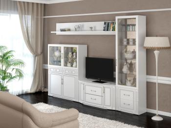 Модульная серия «Виктория» выполнена в стиле «Классика». Особенность серии – фасады МДФ сфрезеровкой, петли с доводчиком на всех фасадах, шариковые направляющие, ручки металлические с белой вставкой, покрытие золото. Стеклянную полку можно установить над и под телевизором, а также заказать на нее подсветку. Шкаф для одежды может быть укомплектован дополнительными полками для белья. Модульная серия Виктория выпускается такжев едином стиле в прихожей, молодежной испальне.НОВИНКАот фабрики Ижмебель – модульная гостиная Виктория, выпускается такжеспальняв едином стиле.