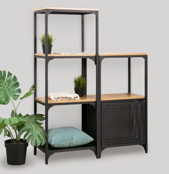Предусмотрены открытые и закрытые полки для хранения. Изделие с элементами из перфорированного металлического листа в прормышленном стиле.