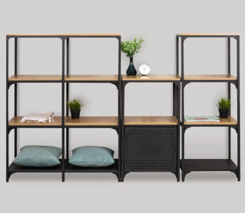 Предусмотрены открытые и закрытые полки для хранения. Изделие с элементами из перфорированного металлического листа в прормышленном стиле.