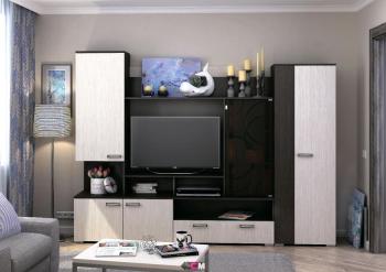Гостиная “СИЕНА” включает в себя сервант для посуды, шкаф с полками закрытый, тумбу для телевизора и шкаф платяной с полкой и штангой.