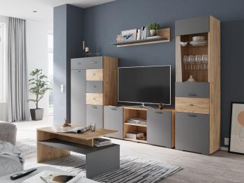 Модульная коллекция Дублин – ультрастильное решение для организации пространства Вашей гостиной. Модули представлены модным цветовым сочетанием, гикори рокфорда и серого графита, который добавляет обстановке тепла и гармонии. Такая мебель будет отлично смотреться в любом современном интерьере. Кроме визуальной привлекательности, гостиная Дублин достаточно функциональна. Комбинируя элементы между собой, Вы сможете не только с комфортом обыграть ТВ-зону, но и расположить домашнюю утварь, посуду, предметы декора.