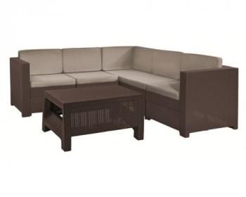 В комплекте диван угловой 5-местный с подушками и столик кофейный, пластик под искусственный ротанг.