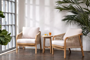 RIMINI – современная коллекция садовой мебели из акации, выполненная в комбинации натурального веревочного плетения rope, массива акации и бежевых подушек.