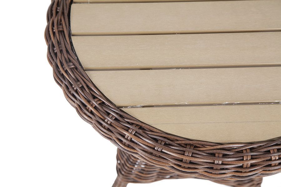 Размер модели – 600×600×480мм. Столик располагает прочным каркасом, который изготовлен из качественного алюминия, отвечающий за надежное расположение конструкции. Весь каркас оплетен вручную круглым искусственным ротангом коричневого цвета.