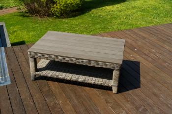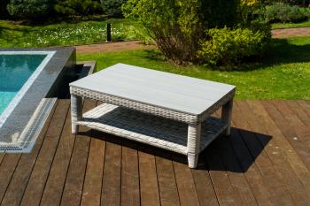Материал: столешница — поливуд (искусственное дерево); каркас — искусственный ротанг/алюминий