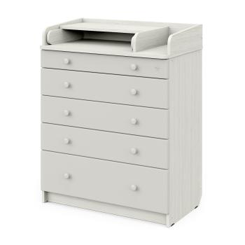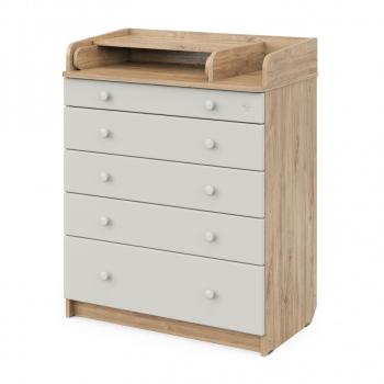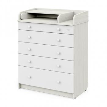 Комод очень вместительный благодаря пяти ящикам, которые установлены на надежные шариковые направляющие бесшумного хода. Нижний ящик большей глубины, а верхний с органайзером для удобства сортировки детских вещей (6 отделений). Глубина ящиков сверху вниз: 8,5 см, 10 см, 10 см, 10 см, 18,7 см.