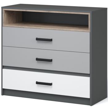 Изготовленный из ЛДСП австрийского производства, комод отличается прочностью и долговечностью. Цвет каркаса антрацит и фасада в оттенке шиншиллы с белым создают элегантный контраст. Комод имеет три вместительных ящика, которые обеспечивают удобное хранение вещей. Задние стенки и дно ящиков выполнены из ламинированной плиты ХДФ, что гарантирует надежность.