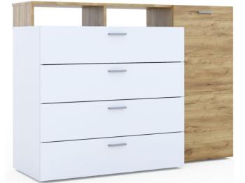 Оригинальный комод Невио – 1 станет незаменимым предметом интерьера в Вашем доме. Яркое сочетание белого цвета с теплым древесным позволит сочетать его с другими предметами мебели и декора, создавать яркие и разнообразные интерьеры. Комод оснащен 4-мя вместительными ящиками полного выдвижения, открытыми и закрытыми полками. Верхняя крышка комода увеличена на 1см, что обеспечивает эстетичный вид сверху. Мебель выполнена из высококачественных экологичных материалов.