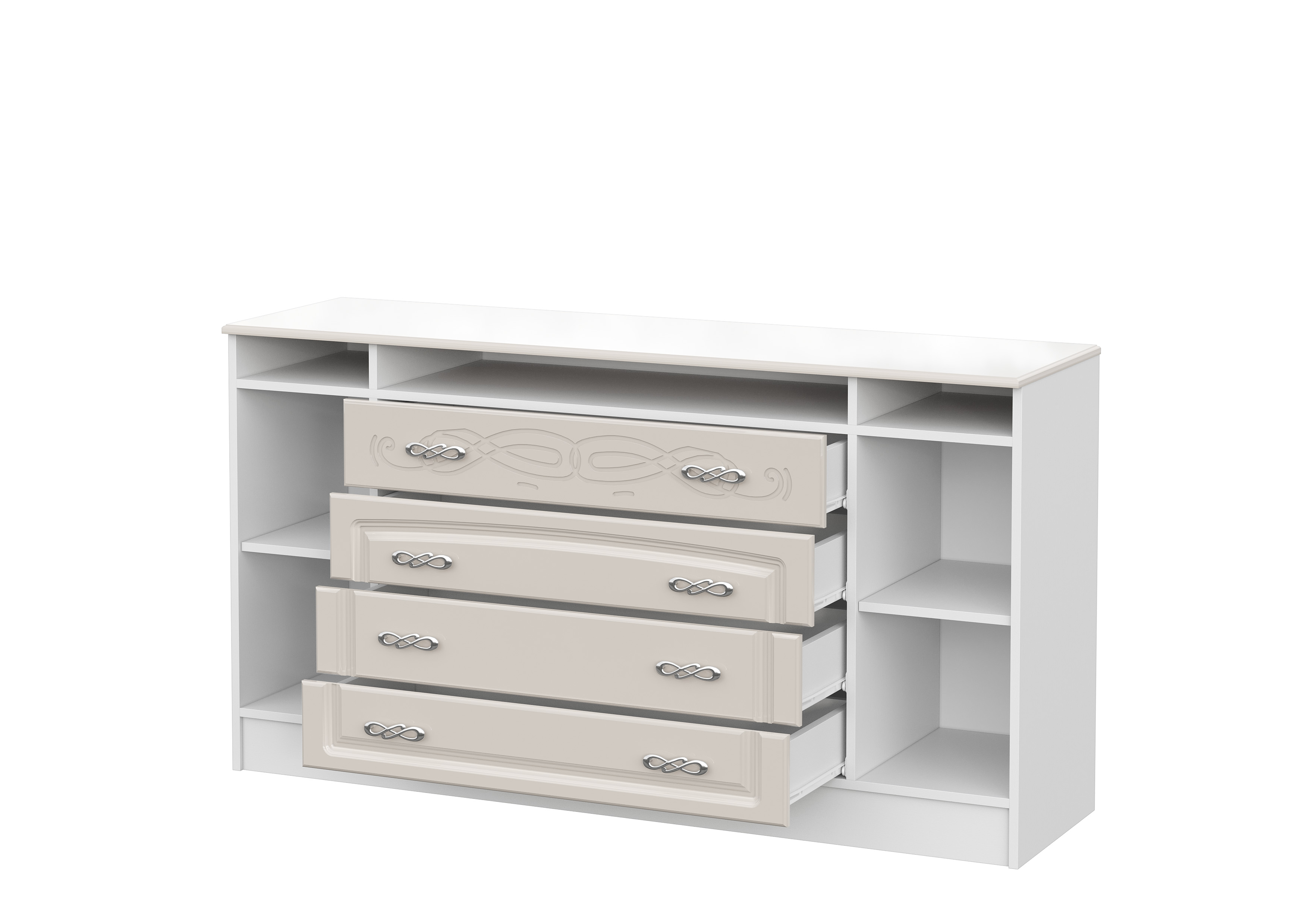 Комод подойдет даже для небольшой спальни, при этом четыре объемных ящика и два отделения за распашными створками вместят белье и другие предметы гардероба